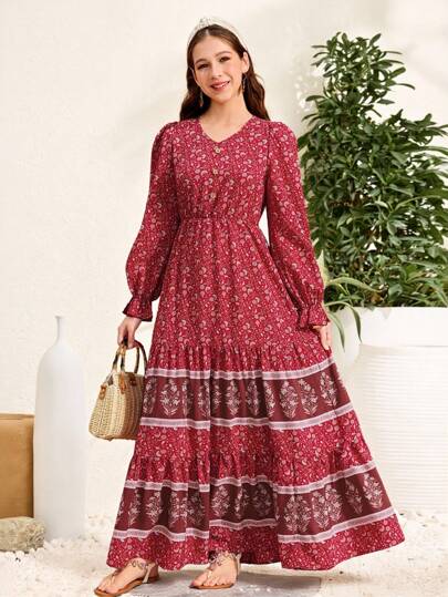 SHEIN Teen Girl Red,Woven Positioning Flower Printing,Loose Casual Long Sleeve Vacation Style V-Neck Button Accented Maxi Dress - Red - View 1