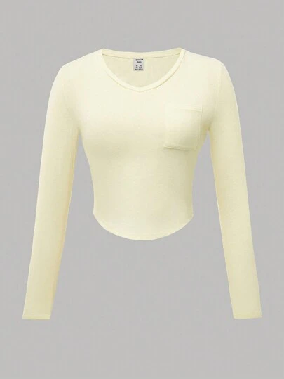 Teen Girl Solid Pocket Patched Curved Hem Tee - Beige - View 1