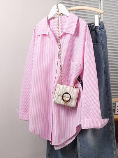 Teen Girl Striped Drop Shoulder Long Sleeve Single-Breasted Pocket Shirt Fall Winter - Pink - View 1