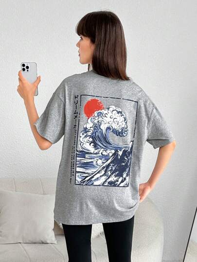 SHEIN Teen Girl Wave & Slogan Graphic Drop Shoulder Tee - Light Grey - View 5