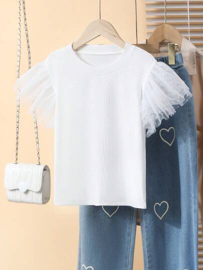 Teen Girls' Polka Dot Mesh Splice T-Shirt, Summer - White - View 1
