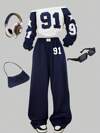 Sparklyn 2pcs Teenage Girls Set: Asymmetrical Neck Long Sleeve Sweatshirt Number & Pentagram Print + Casual Sports Letter Print Wide Leg Pants Suit, Suitable For Daily, Street, Leisure, Vacation Fall Winter