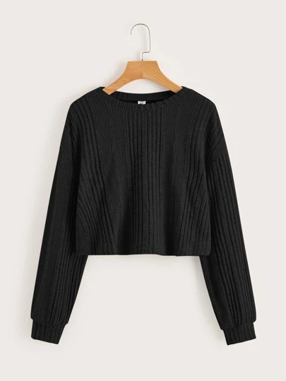 SHEIN Leap Crew Teen Girls' Casual Long Sleeve Drop Shoulder Knit Tee With Ribbed Texture - Black - View 1