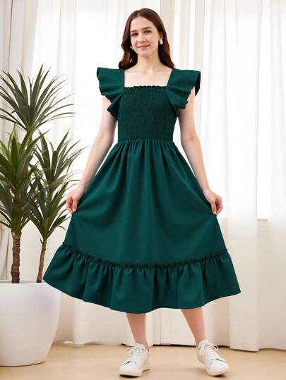 Teen Girls Shirred Bodice Ruffle Hem Dress,Holiday,Summer,Travel Summer Holiday - Dark Green - View 1