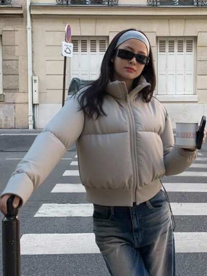 Teen Girls' Short Zip-Up High Collar Padded Coat, Casual Commuter Wear, Autumn/Winter Fall - Grey - View 1