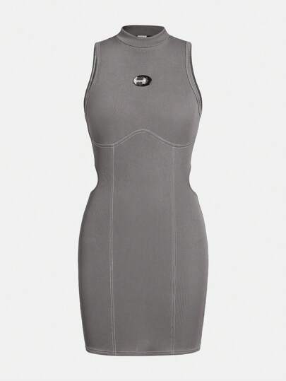 Teen Girls' Sleeveless Knitted Dress With Embellished Rhinestone Letter Stand Collarline - Grey - View 4