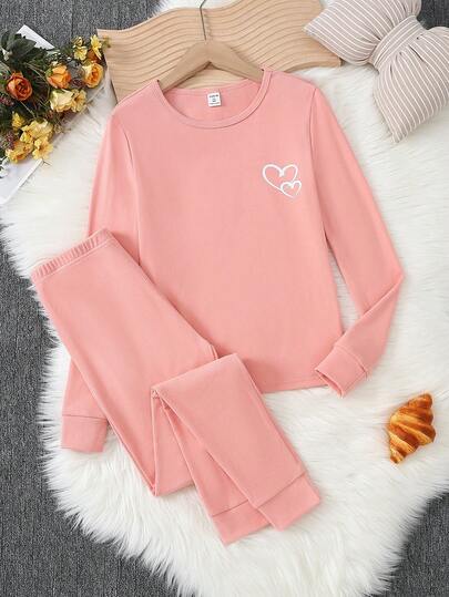 Teenage Girls Pink Crew Neck Long Sleeve & Pants Knit Comfortable Soft Stretchy Fabric Heart Print Design Fashion Casual 2 Pieces Loungewear Set - Pink - View 1