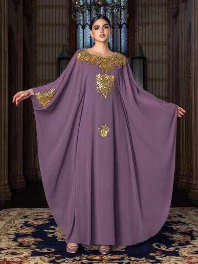 This Elegant Chiffon Floor-Length Dress With A Shawl Collar, Featuring A Lightweight And Flowing Silhouette, Is Adorned With Gold Beads And Sequins, Making It An Ideal Choice For Weddings, Formal Galas, Awards Ceremonies, And Red Carpet Events. - Purple - View 1