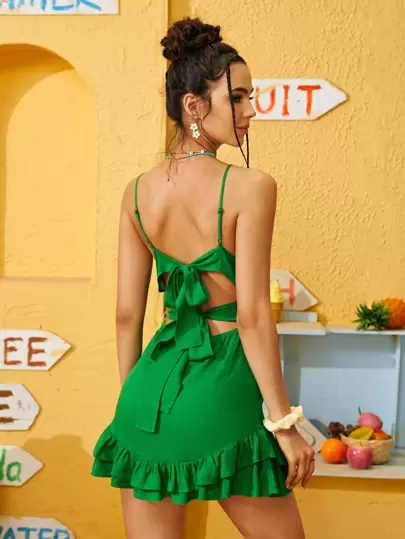Soleia Tie Back Ruffle Hem Cami Dress - Green - View 1
