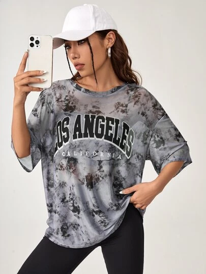 SHEIN Coolane Tie Dye Letter Graphic Drop Shoulder Mesh Top - Multicolor - View 1