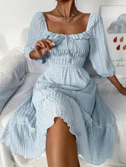 Chiquease Tie Front Ruffle Trim Flounce Hem Dress - Baby Blue - View 1