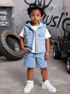YOUNG BOYS Denim Set, Mid-Blue Vintage Color, Hooded Vest Top Paired With Loose Cargo Denim Shorts, Casual Street Style
