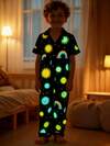 NEWYoung BoyColorful Galaxy, Sun, Neon Print Glow-In-The-Dark Collar Cardigan Short Sleeve Pajama Set