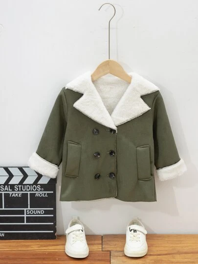 Toddler Boys Double Breasted Teddy Lined Coat - Army Green - View 1