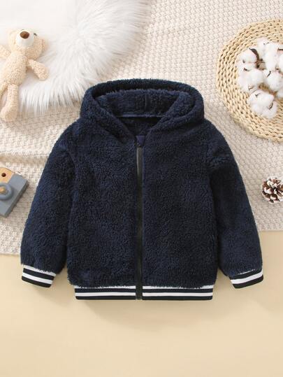 Toddler Boys Striped Trim Hooded Teddy Jacket - Navy Blue - View 1