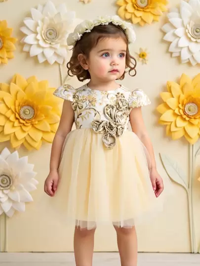 Toddler Girls' Floral Print Waisted Tulle Puff Dress For Birthday/Party - Champagne - View 1