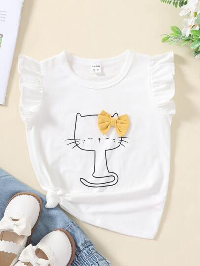 SHEIN Young Girl Cartoon Graphic Ruffle Trim Bow Front Tee - White - View 1