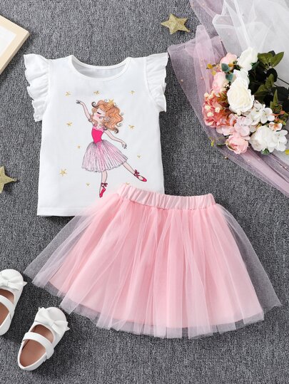 SHEIN Young Girl Geometric Pattern Figure & Cute Dancing Girl Mesh Skirt With Half Collar And Ruffled Sleeves 2pcs Set For Summer - Multicolor - View 1