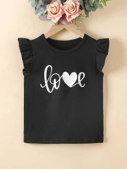 Toddler Girls Heart & Letter Graphic Ruffle Trim Tee - Black - View 1