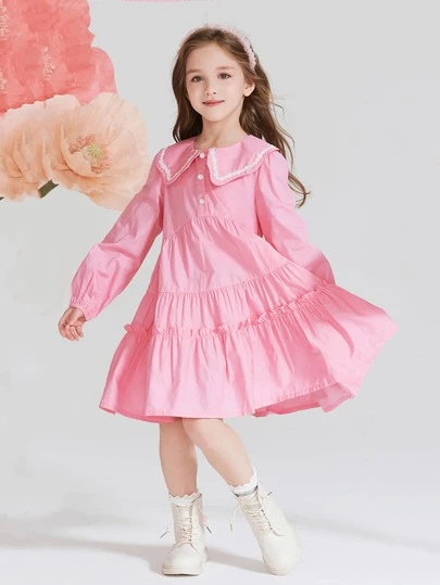 Toddler Girls Peter Pan Collar Ruffle Hem Smock Dress - Pink - View 1