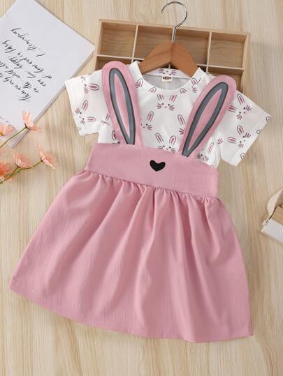 Toddler Girls Rabbit Print Tee & 3D Ear Design Pinafore Skirt - Multicolor - View 1