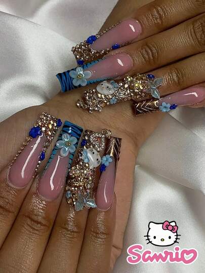 24pcs Long Coffin Nail Stickers, Sanrio Blue Striped French Style Hello Kitty, Blue Floral & Butterfly Gold Glitter Decals Set With 1pc Nail Gel And 1pc Cuticle Pusher, Suitable For Women Daily, Party, Event - Multicolor - View 1