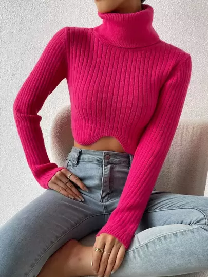 SHEIN Essnce Turtle Neck Asymmetrical Hem Crop Sweater - Hot Pink - View 1