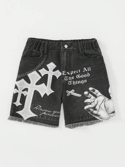 Tween Boy Lightweight Denim Shorts With Trash Punk Chain Print Pattern, Summer 2025 Collection, Suitable For Spring/Summer Festival, Beach, Casual Daily Wear - Black - View 1