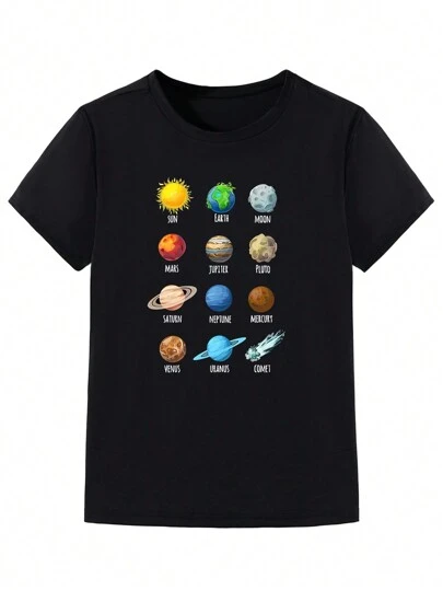 Tween Boy Astronomy Galaxy Planet Enthusiasts Fun Printed Comfortable Loose Short Sleeve T-Shirt - Black - View 1