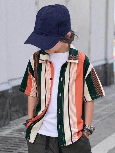SHEIN Tween Boy Front Button Striped Simple Casual Vacation Shirt - Brown - View 1