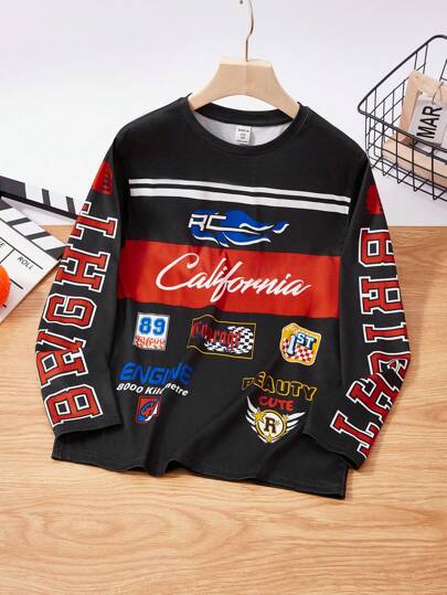 SHEIN Leap Crew Tween Boy Sports Car Printed Long Sleeve T-Shirt - Black - View 1
