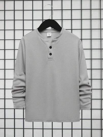 SHEIN Leap Crew Tween Boys' Casual Gray Solid Color Waffle Grid Patterned Long Sleeve Knit T-shirt With Buttoned Placket, Autumn Winter - Light Grey - View 1