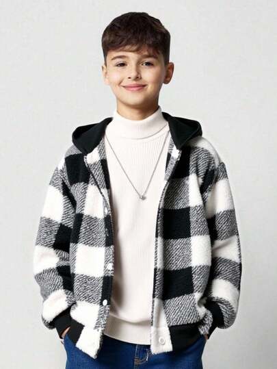 Tween Boys Casual Plaid Fleece Hooded Jacket, Open Front Loose Thick Outerwear For Autumn/Winter, Boys Teddy Jacket, Boys Plaid Jacket, Kids Black And White Hoodie Fall - Black - View 1