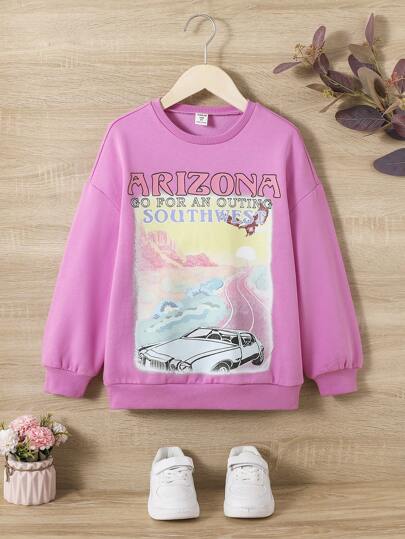 SHEIN Tween Girl Car & Slogan Graphic Drop Shoulder Thermal Sweatshirt - Pink - View 1