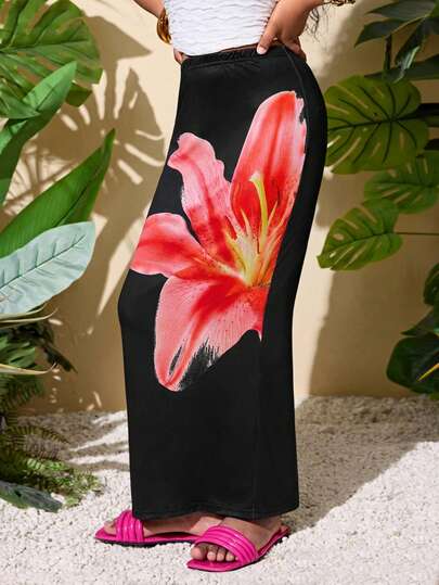 SHEIN Tween Girl Casual Vacation Tropical Print Snug Fit Mini Skirt - Coral Orange - View 1