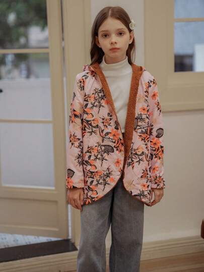 SHEIN Áo khoác dài tay in hoa cho bé gái tuổi mới lớn, Thu/Đông
