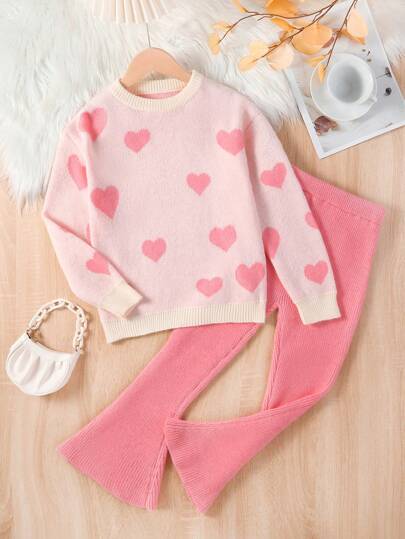 SHEIN Tween Girl Heart Pattern Sweater & Flare Leg Knit Pants - Pink - View 1