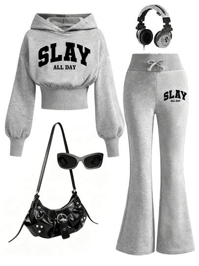 Tween Girl Letter Graphic Hoodie Sweatshirt And Flare Pants Set - Grey - View 1
