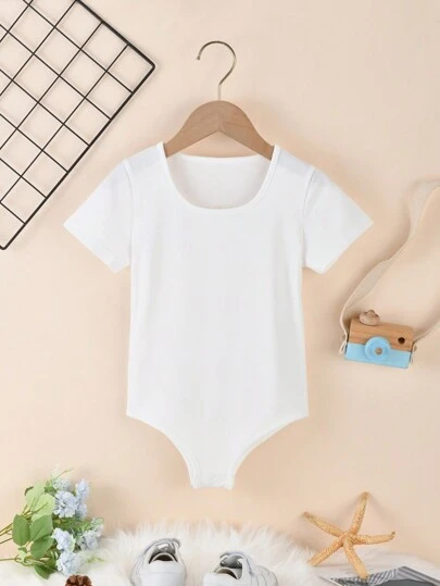 Tween Girl Round Neck Solid Color Short-Sleeved Bodysuit - White - View 1