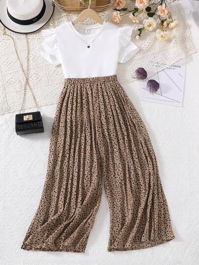 Tween Girl Ruffle Trim Tee & Dalmatian Print Wide Leg Pants - Multicolor - View 1