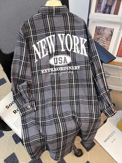 Tween Girl Vintage School Woven Casual Plaid & Letter Graphic Drop Shoulder Colorblock High Low Hem Coat, Long Shirt Coat - Dark Grey - View 1