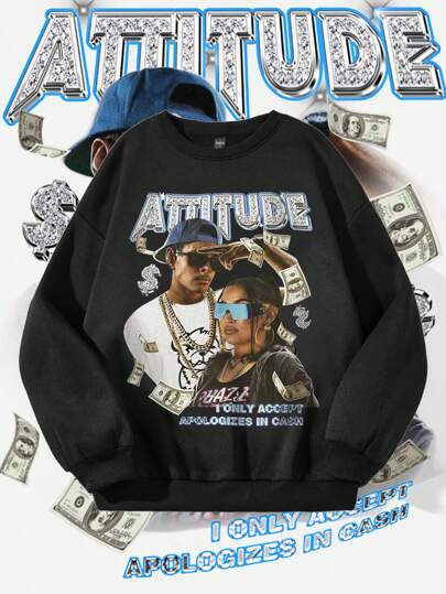 SHEIN Tween Girls' Letter & Figure Print Round Neck Drop Shoulder Long Sleeve Sweatshirt In Black, Autumn - Black - View 1