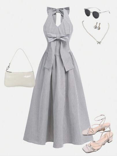 SHEIN Tween Girls Bow Decor Striped Mid-Length Casual Dress - Light Grey - View 1