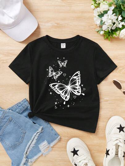 SHEIN Tween Girls' Casual Cartoon Print Short Sleeve T-shirt Suitable For Summer - Black - View 1