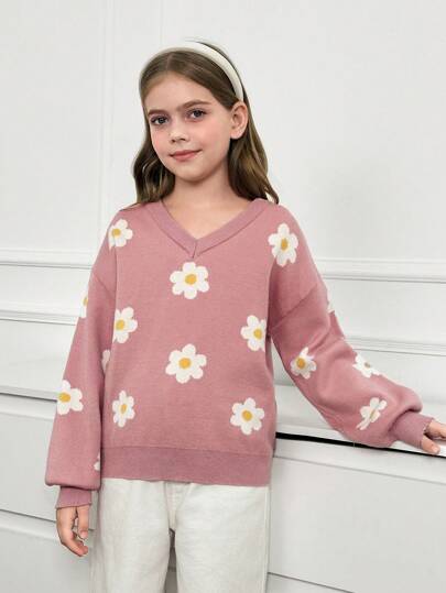 Tween Girls Casual Floral Intarsia V-Neck Pullover Knitted Sweater - Pink - View 1