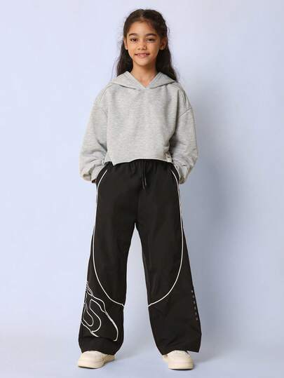 SUMWON Tween Girls Crop Overhead Raw Hem Hoodie And Loose Fit Pant With Graphic Print 2 Piece Set Vacation - Grey - View 1