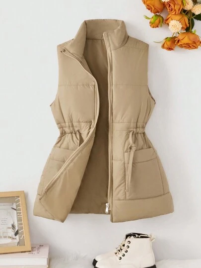 SHEIN Tween Girls Fashionable Mid-Length Stand Collar Cinched Waist Pockets Warm Padded Vest Suitable For Outings - Khaki - View 1