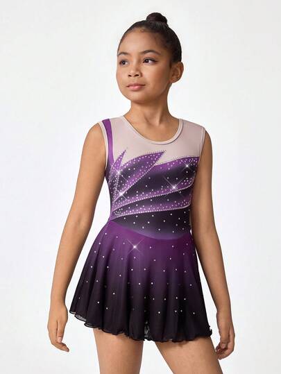 Tween Girls' Gymnastics Leotard, Sleeveless Ombre Purple & Black Gradient Rhinestone Mesh Splice Bodysuit, Stretchy Knit Fabric Comfortable Fitness Jumpsuit - Black - View 1