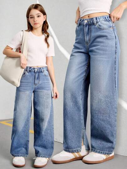 Tween Girls Lightweight Washed Denim Joggers With Elastic Waist, Zipper Front, And Slit Hem, Casual Style - Light Wash - View 1