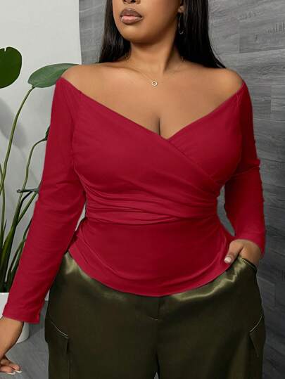 SHEIN SXY Plus Size Women Off Shoulder Crisscross Ruched Tee - Burgundy - View 1